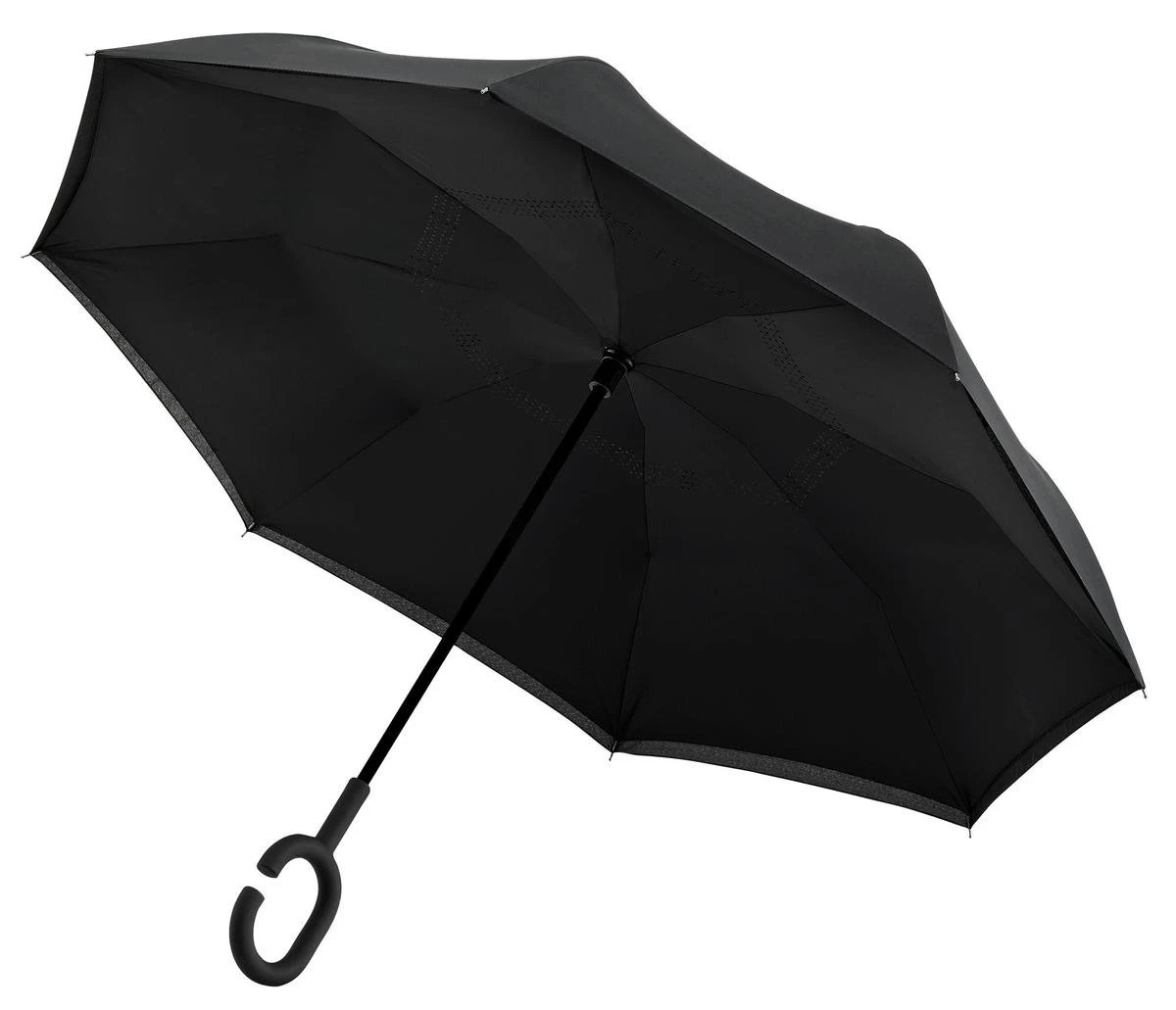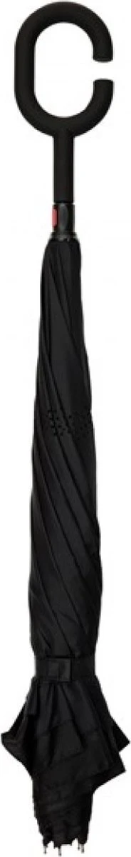 Inside Out paraplu, dubbeldoeks, windproof, zwarte stok en glasfiber frame en easy opening systeem. Het speciale ontwerp maakt het mogelijk dat deze paraplu – wanneer gesloten – volledig op zichzelf op de grond kan worden geplaatst, dus zonder enige ondersteuning en is uitgerust met een speciale C-vormige handvrije greep.