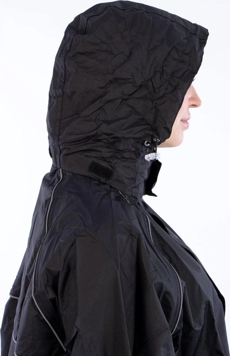 De broek heeft een elastische tailleband en de onderzijde van de pijp kan versteld worden m.b.v. klittenband. Met de reflectie strepen voor- en achter ben je ook op de donkerste dagen goed zichtbaar! De set wordt geleverd in een handig draagtasje.